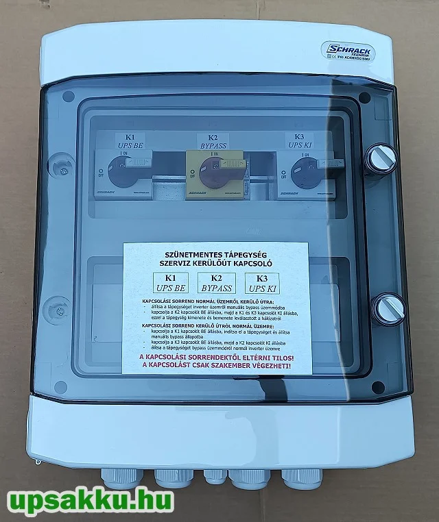 Minőségi anyagokból készült fali bypass szekrény 3/1 vagy 3/3 fázisra max. 40kVA terhelésre (63A kapcsolókkal). A szekrény az aktuális rendelkezésre álló anyagok fényében némileg eltérhet, de a beltartalom ugyanolyan.